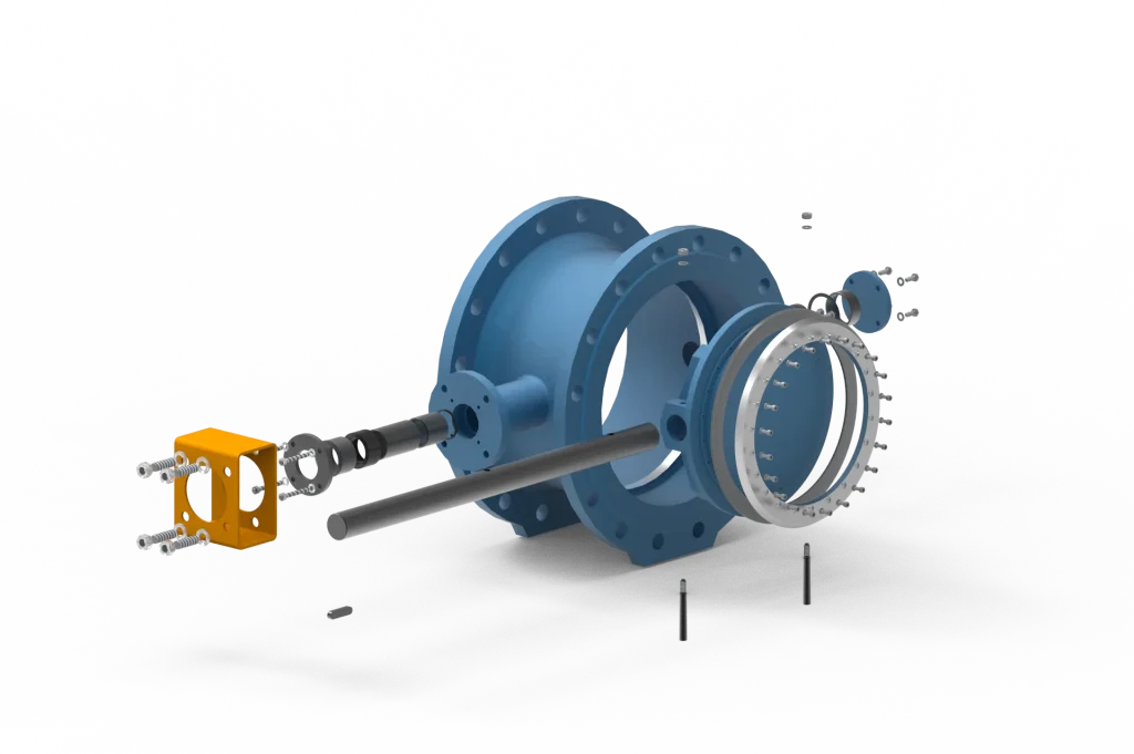 Ventil se sastoji od precizno obrađenog kućišta, osovine, zapornog elementa, brtvenog sustava te pogonskog mehanizma. Takva konstrukcija omogućuje kontroliran protok, visoku nepropusnost i stabilan rad čak i pri velikim promjerima i opterećenjima.